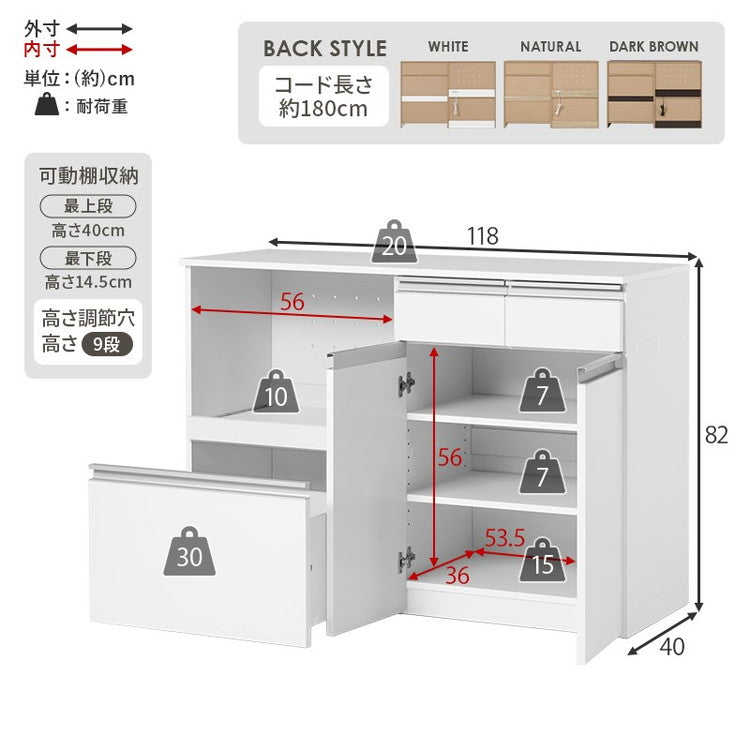 キッチンカウンター 幅118 収納庫タイプ 2口コンセント 深型ドロワー 大容量 スライド棚 引き出し キッチン収納 キャビネット 食器棚 レンジ台 レンジボード キッチンボード おしゃれ(代引不可)
