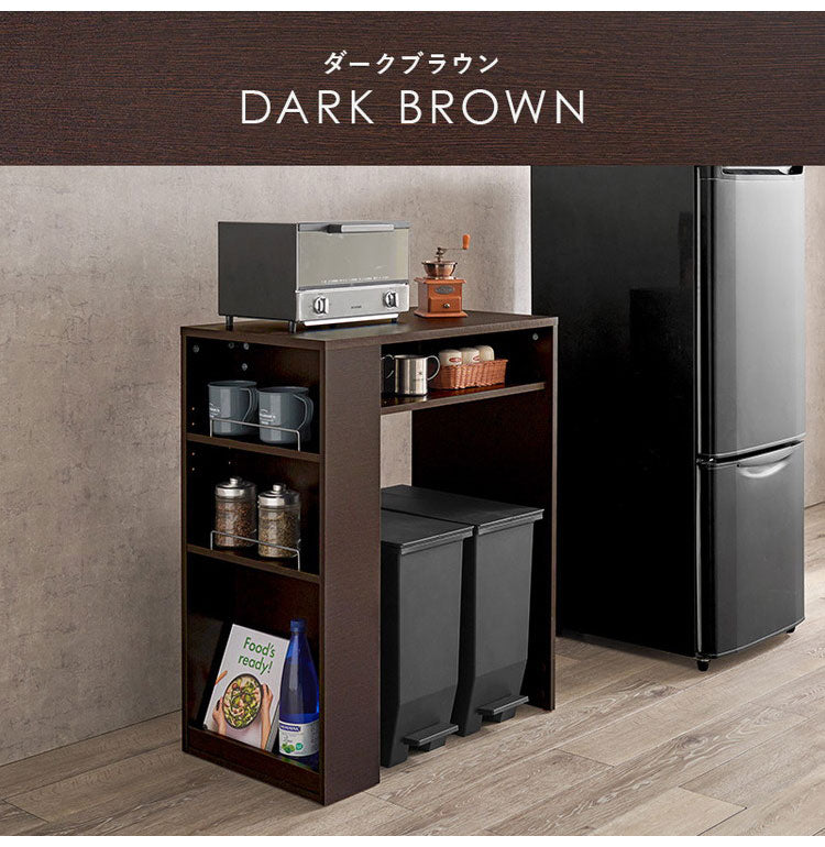 ごみ箱上のスペースを有効活用できる、シンプルデザインのラック。天板下やサイドにオープン収納が付いていてキッチン小物も収納可能。