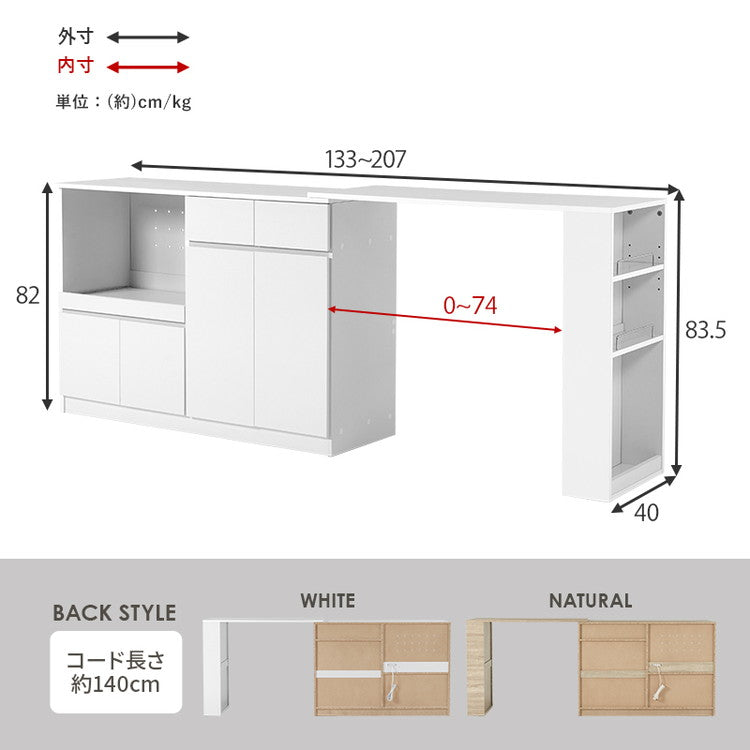 伸縮キッチンカウンター 2点セット 幅133~207 フラット 2口コンセント スライド棚 引出し 扉収納 キッチン収納 キャビネット 食器棚 レンジ台 レンジボード ごみ箱上ラック(代引不可)