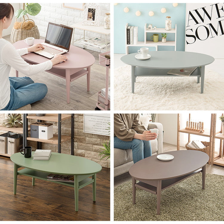 くすみカラーが可愛い折れ脚テーブル。雑誌などをサッと収納できる棚付き。角のないオーバルタイプ