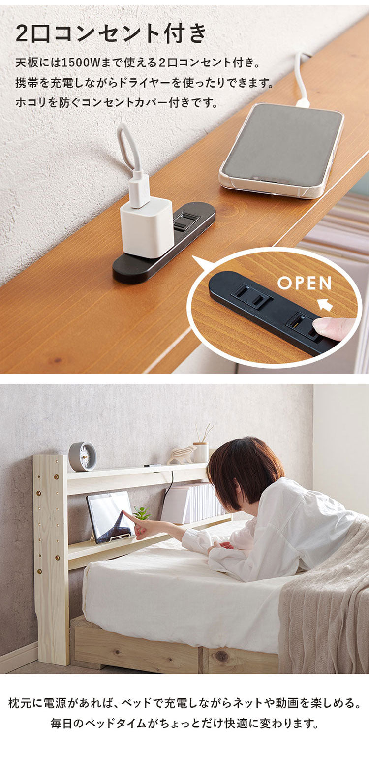 ベッドと壁の隙間に挟んで置くだけで枕元スッキリ収納。棚板の高さが変えられ、コンセント付きなので便利。シングルサイズ対応、幅98cm