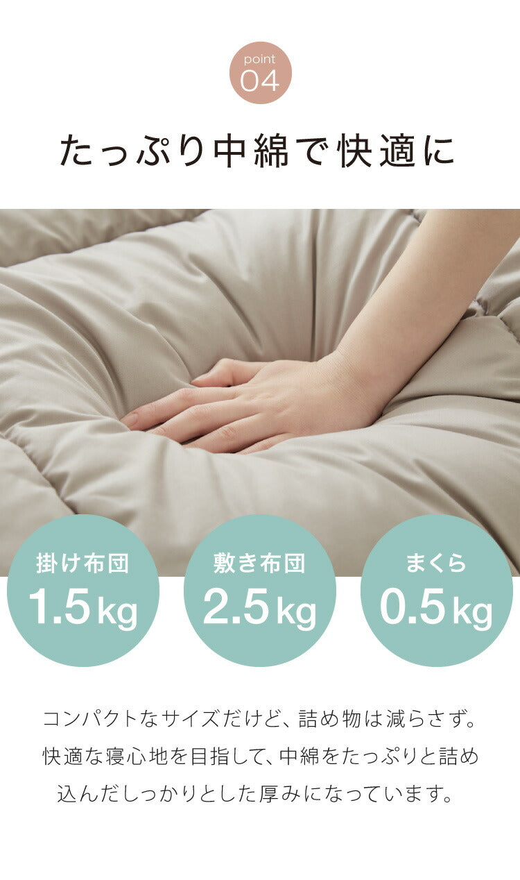 セット内容:掛け布団、敷き布団、枕、枕カバー、収納ケース