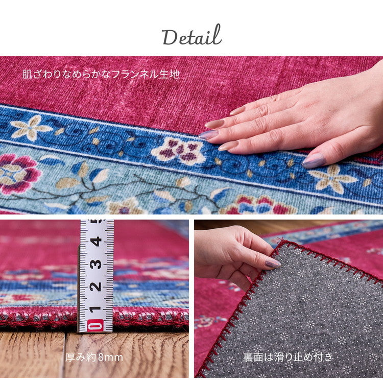 どこか東洋を感じさせるような花柄の絨毯風デザイン。その細やかなデザインを、転写プリントで美しく表現したなめらかフランネルラグ。