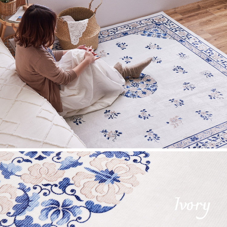 洗える 花柄フランネルラグ ミュゲ 約190×240cm 手洗いOK 滑り止め付き フェミニン シノワズリ 転写 韓国インテリアかわいい 可愛い おしゃれ(代引不可)