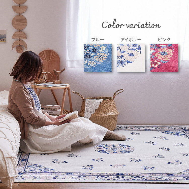 どこか東洋を感じさせるような花柄の絨毯風デザイン。その細やかなデザインを、転写プリントで美しく表現したなめらかフランネルラグ。