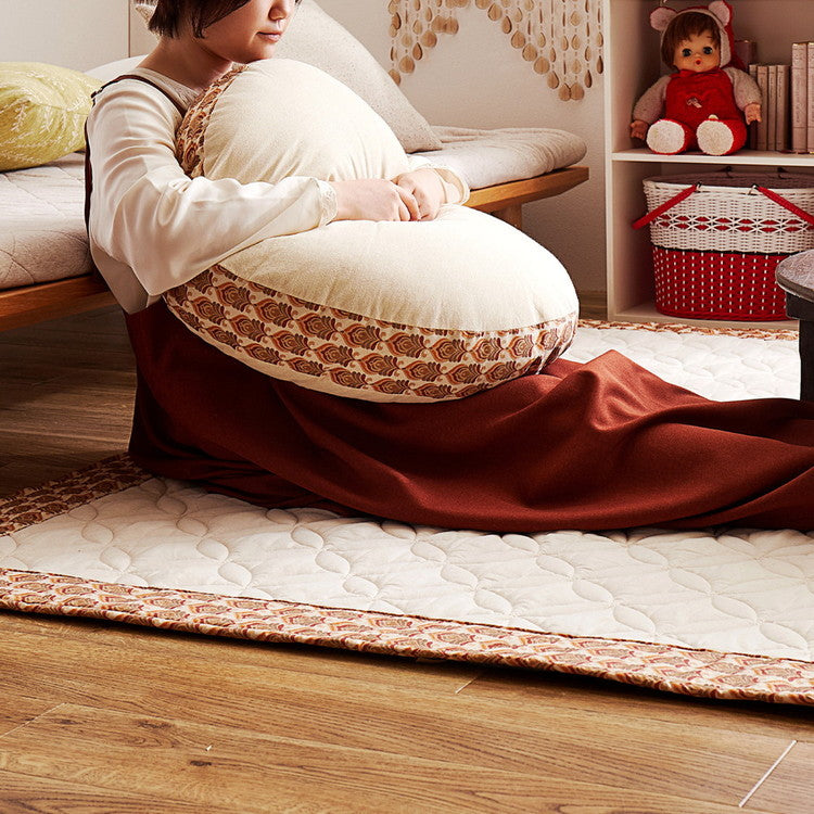ふっくらとボリュームがあり、座ったり寝転んだりと、いろいろ使えるラウンドクッションです。