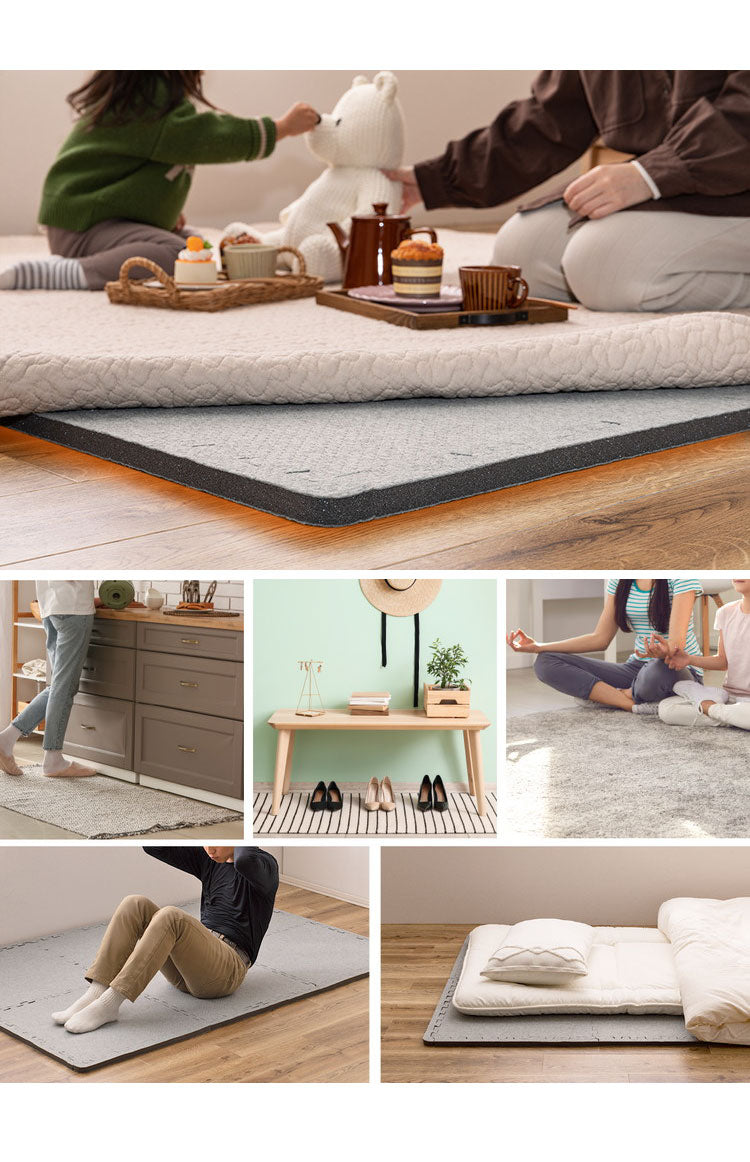 ■ジョイント式の魅力はどんな形状にも合わすことが出来る事。キッチンマットの下や玄関マットの下に敷いたり、敷布団の下に敷いて底冷え対策にも使えます。筋トレやヨガマットなど活躍する場は無限大です。