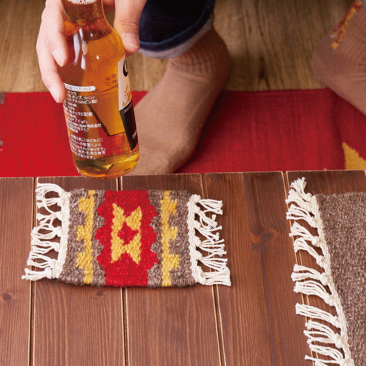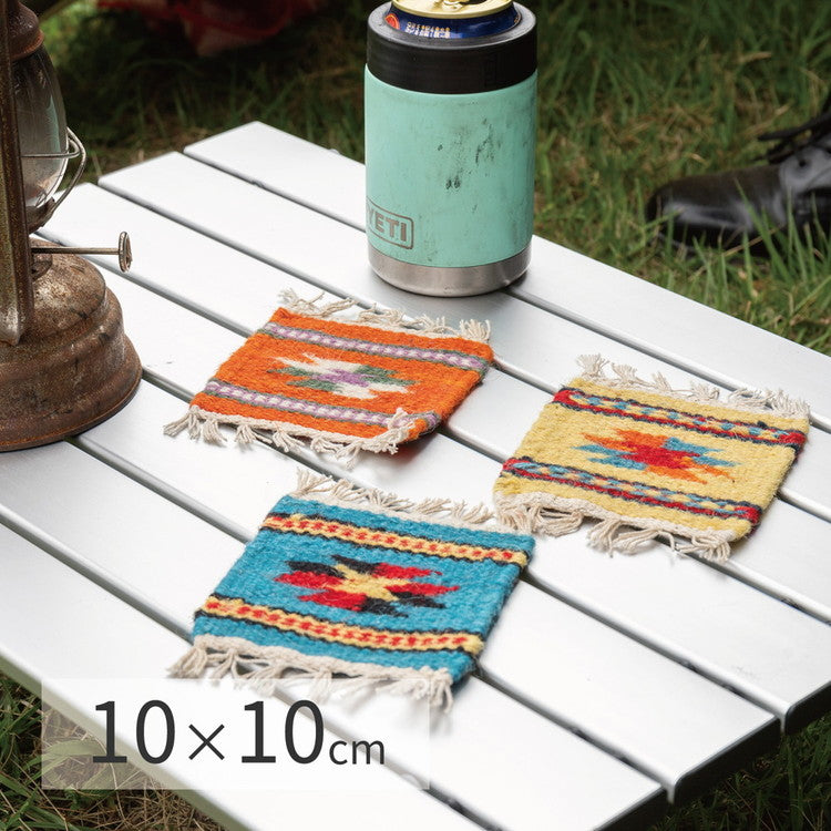 一枚一枚手織りで作ったキリム柄のコースター。 ウール100%のナチュラルで優しい風合いが、空間に温かみをプラスします。 エスニックなデザインはお部屋のアクセントにぴったり。 燃えにくく丈夫な素材なので、キャンプなどのアウトドアシーンでも大活躍! 何枚も揃えて使いたくなるかわいさです。