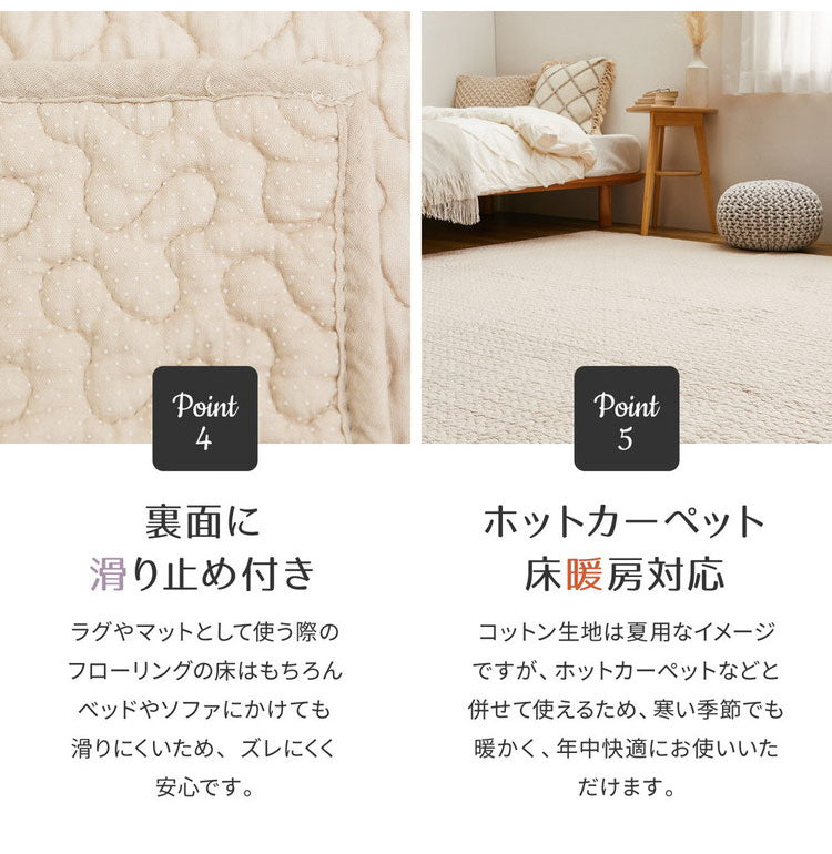裏に滑り止めが付いているからズレにくくて安心!ラグマットとしてや、ソファカバー、ベッドカバーなど、様々な場面で活躍してくれる一枚です。