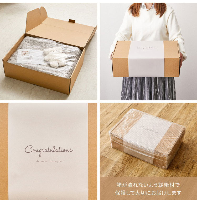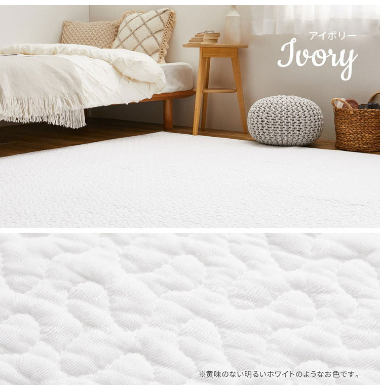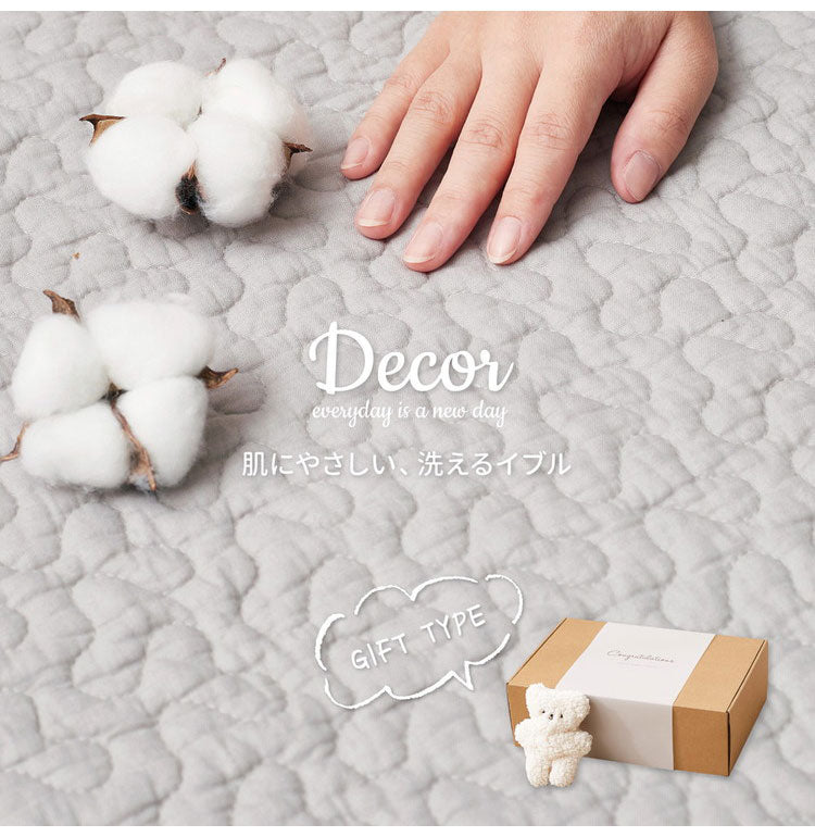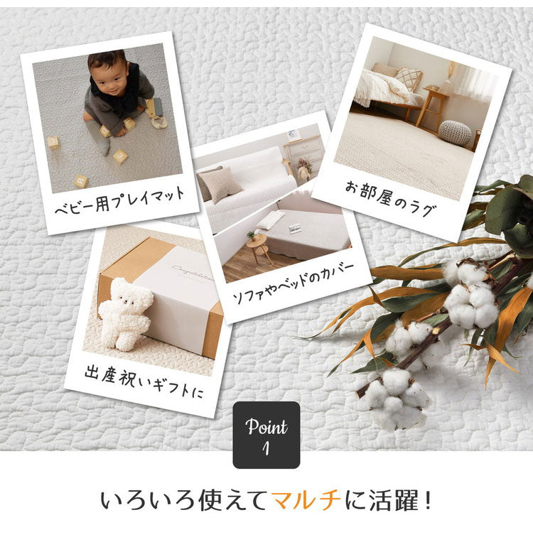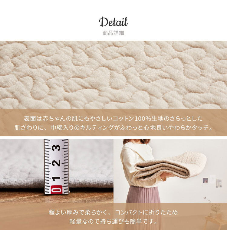 韓国インテリアでおなじみの「イブル」のラグ。コットン100%で赤ちゃんの肌にもやさしく、中綿が入ったキルティング生地でふわっとやわらかな肌ざわり。
