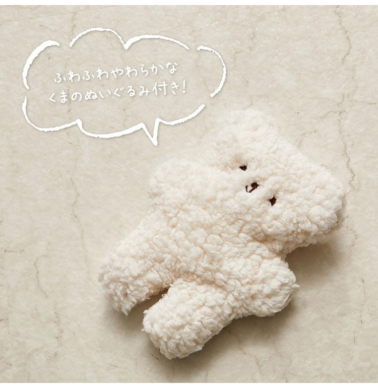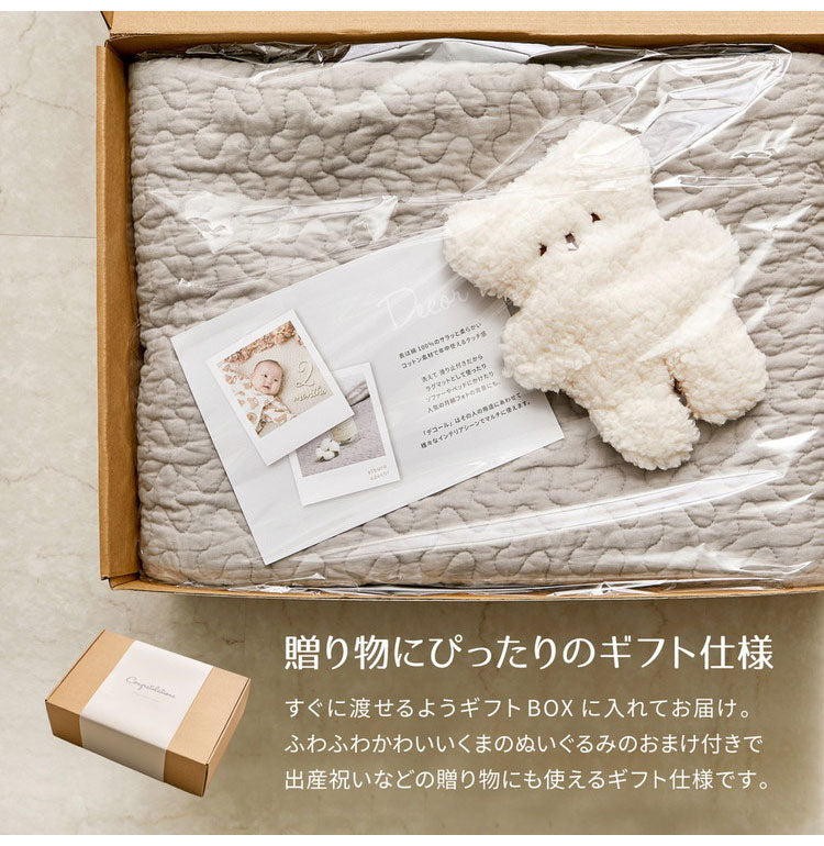 出産祝いなどのギフトに使える、ギフトボックス仕様です。ふわふわのかわいらしいくまのぬいぐるみ付き。