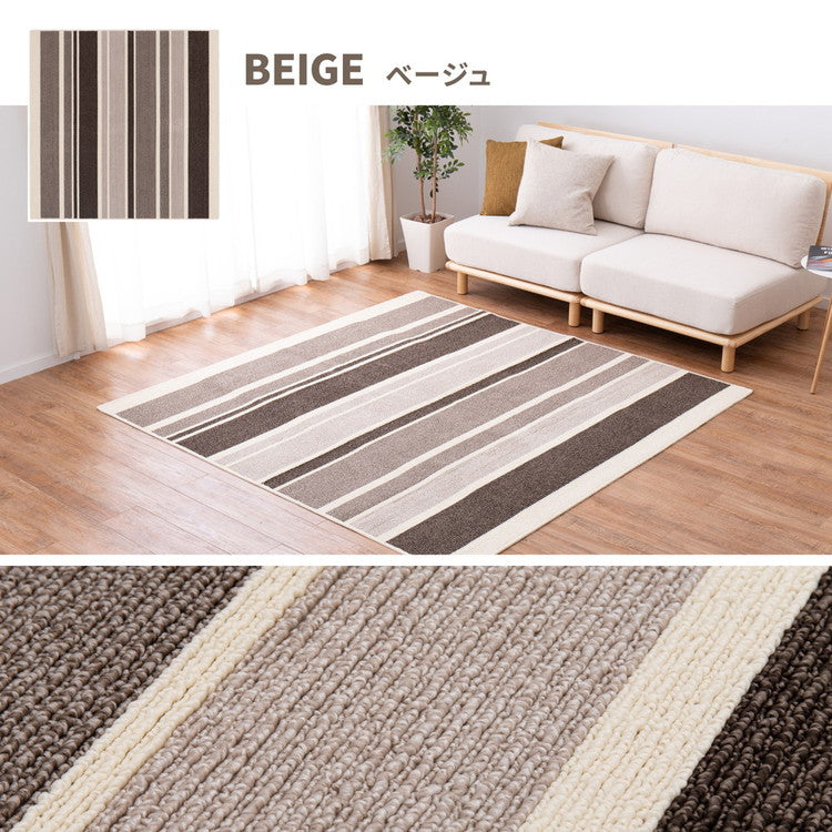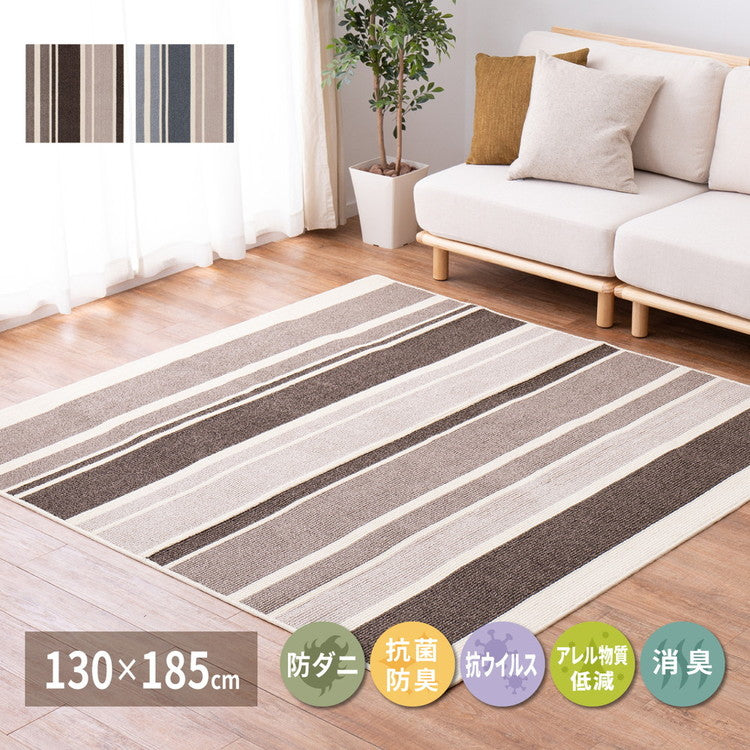 ボーダー柄の高機能国産ラグ。 暮らしにうれしい抗菌、防臭、防ダニ機能、さらに抗菌防臭 抗ウィルス・アレル物質低減も兼ね備えています。 落ち着いたカラーと柄で、すっきりとしたお部屋にぴったりです。