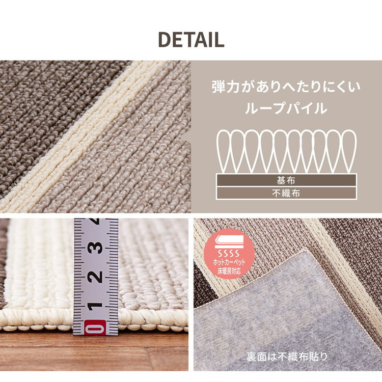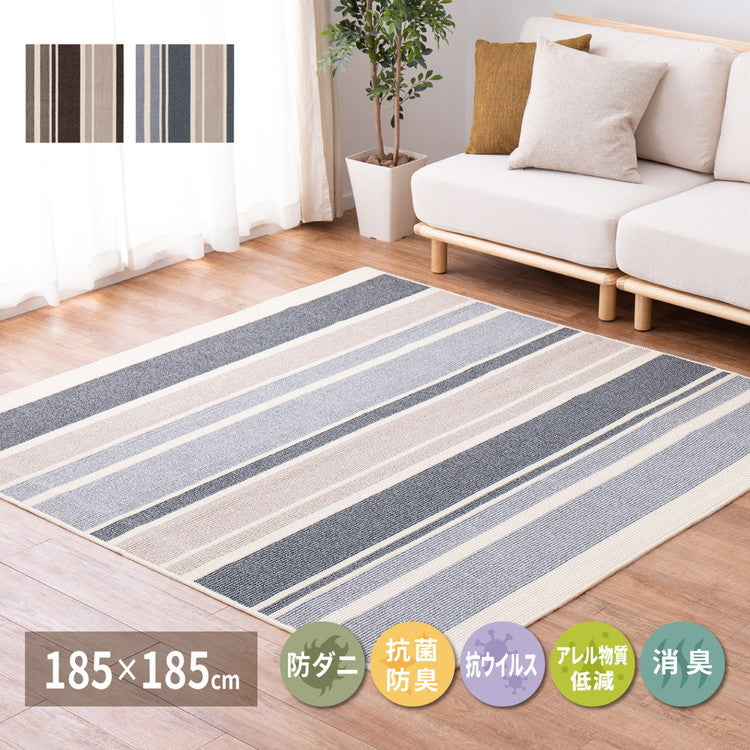 ボーダー柄の高機能国産ラグ。 暮らしにうれしい抗菌、防臭、防ダニ機能、さらに抗菌防臭 抗ウィルス・アレル物質低減も兼ね備えています。 落ち着いたカラーと柄で、すっきりとしたお部屋にぴったりです。