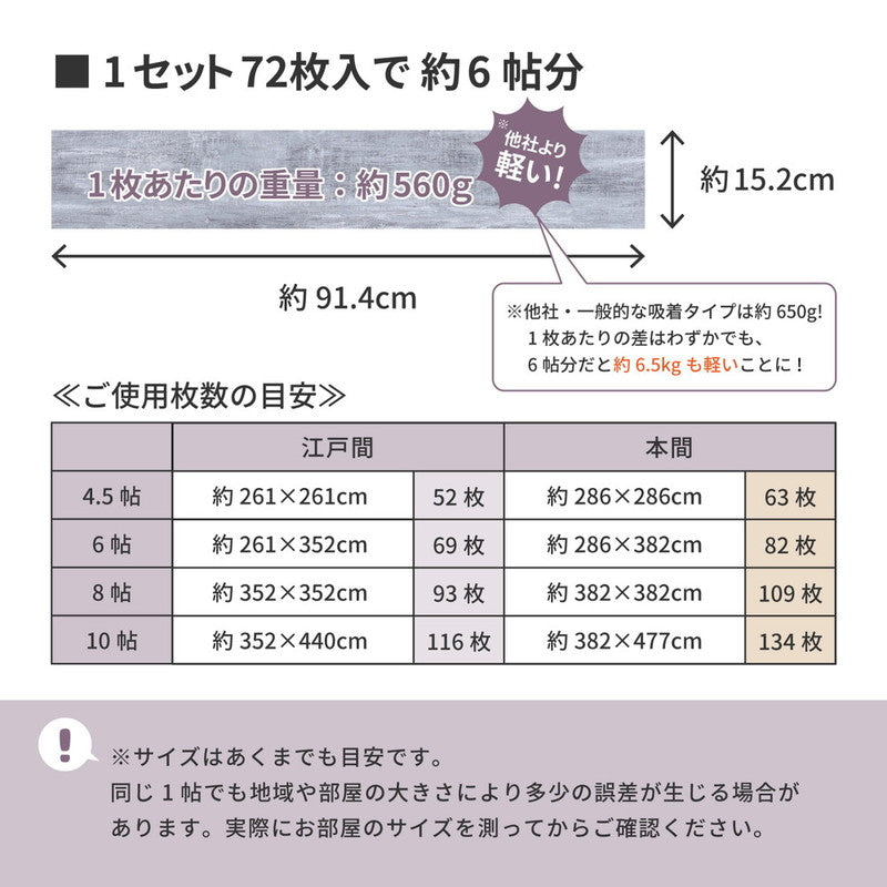 【サイズ】約91.4×15.2cm (厚み約3mm) 72枚入り(約6畳分)
