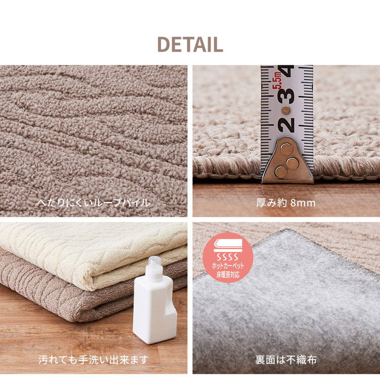 色ではなくパイルの長さで表現された模様は、すっきりシンプルながら温かみがあり、ほっこりとしたお部屋作りにおすすめです。