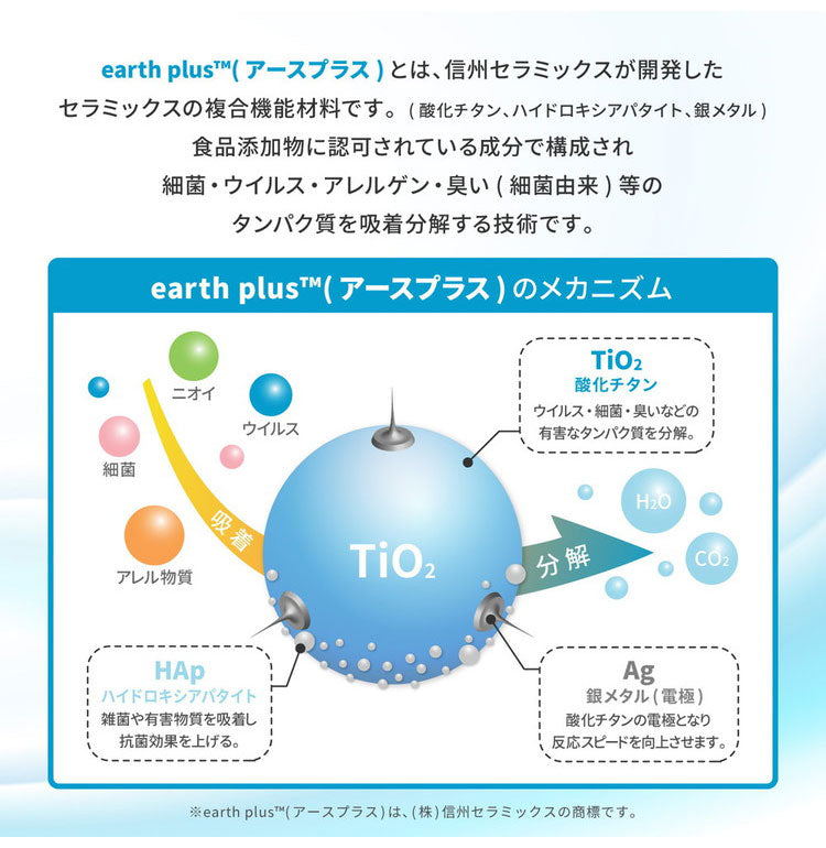 抗ウイルス・アレル物質低減で花粉対策ができ、 さらに消臭、抗菌防臭機能、アース防ダニ機能もついた安心の1枚です。