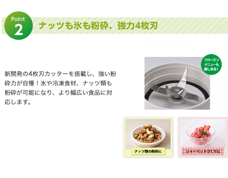 早朝や深夜も安心して使える作動音が約55dBの低騒音設計のミル・ミキサー。新開発の4枚刃カッターを搭載し、強い粉砕力が自慢!氷や冷凍食材、ナッツ類も粉砕が可能になり、より幅広い食品に対応します。カッターのエッジは刃(やいば)をつぶして丸く加工。お手入れの際に指が切れる危険を低減しました。レンジ加熱ができるガラス容器だからホットスムージーやポタージュスープもカンタン。からだにやさしいヘルシーメニューが驚きの手軽さで作れます。丸ごと煮沸消毒可能なカッターとガラス容器だからニオイの除去や除菌もできて清潔に使えます。ガラス容器をセット後、さらにカバーをかけないと作動しないカバースイッチ方式を採用。作動時にカッターに触れることのない安全な構造を採用しています。