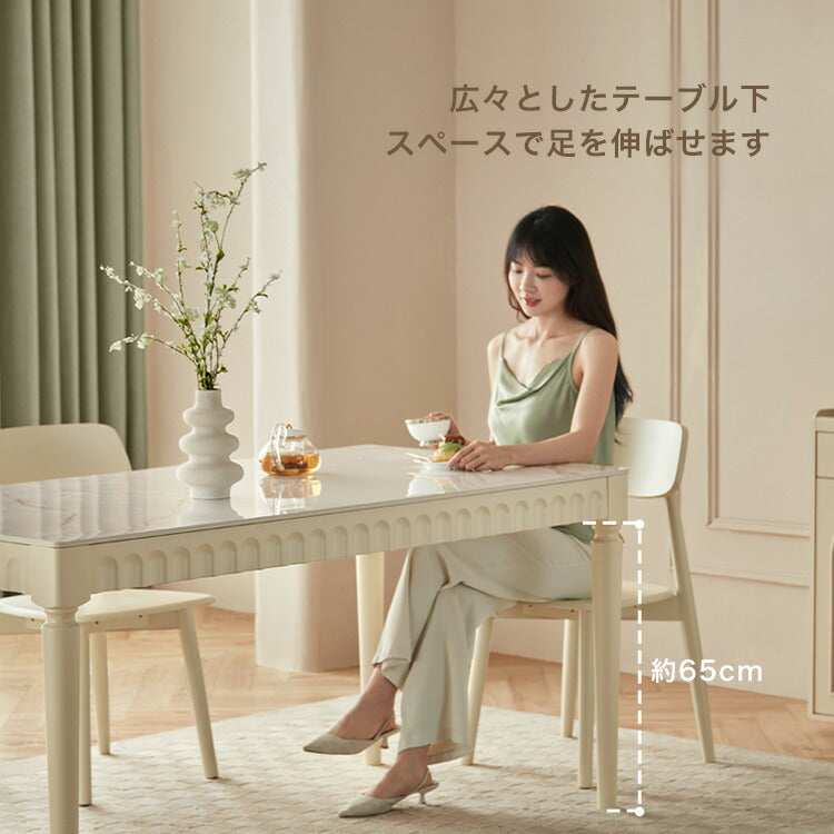 広々とした無垢材テーブルと快適なシェルチェア4脚の組み合わせのダイニングセット。テーブルは厚みのある天板とアーチ型の脚で高級感と安定感をもたらし、広い座面と滑らかなチェアは優れた座り心地を提供します。