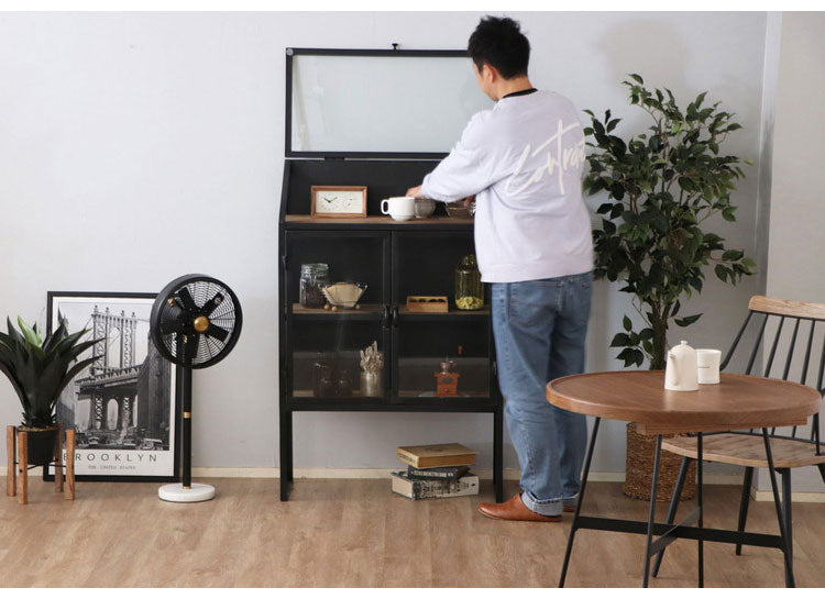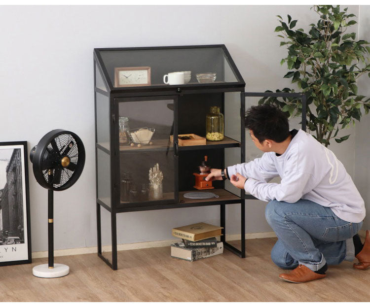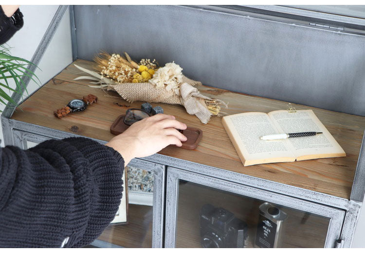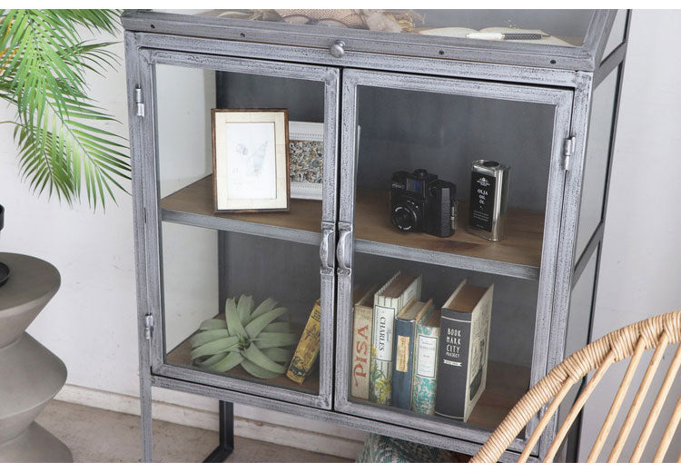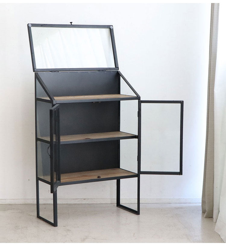 スチールでメンズライクのスタイリッシュな印象のディスプレイ用のガラスキャビネット。