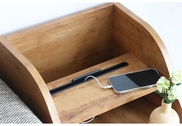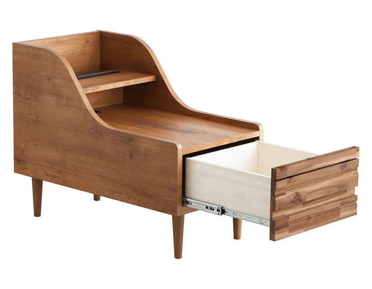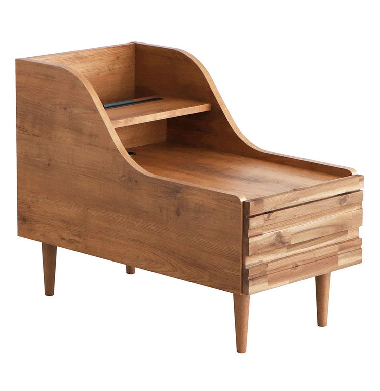 通常のシンプルな天板だけあるサイドテーブルに比べ、引き出し収納やアイパッドを立てて収納できるタブレットフォルダー付。