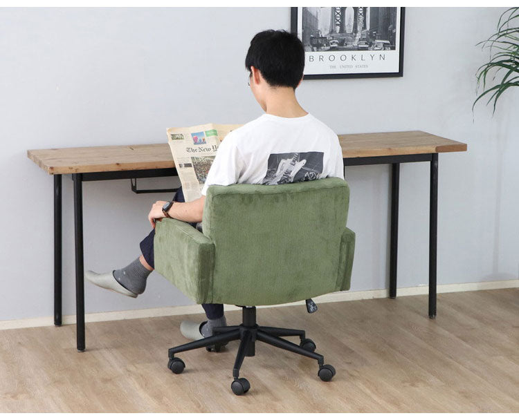 アップタウンのデスクシリーズWORC(ウォルク)より張地にコーデュロイ、肘あてにはブラウン色の木材を採用。