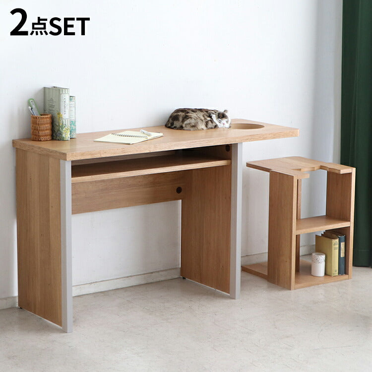 天板に穴の空いたデスクと、天板デザインがキュートなサイドテーブルのセット。