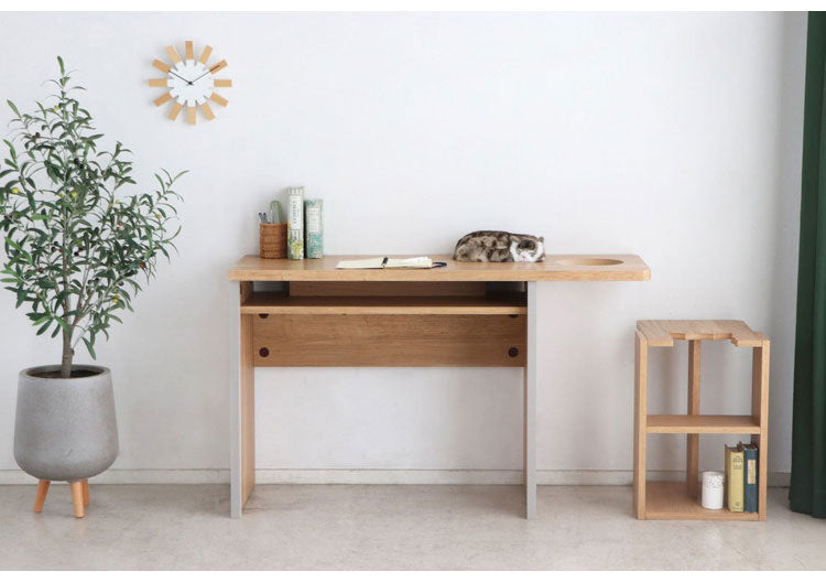 猫がサイドテーブルを踏み台にデスクに登れる、猫のための家具セットです。