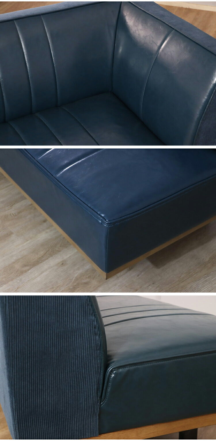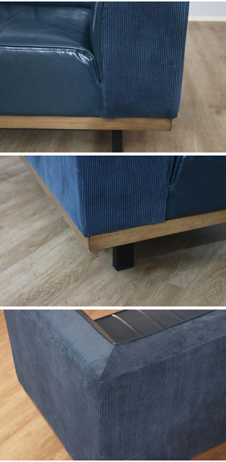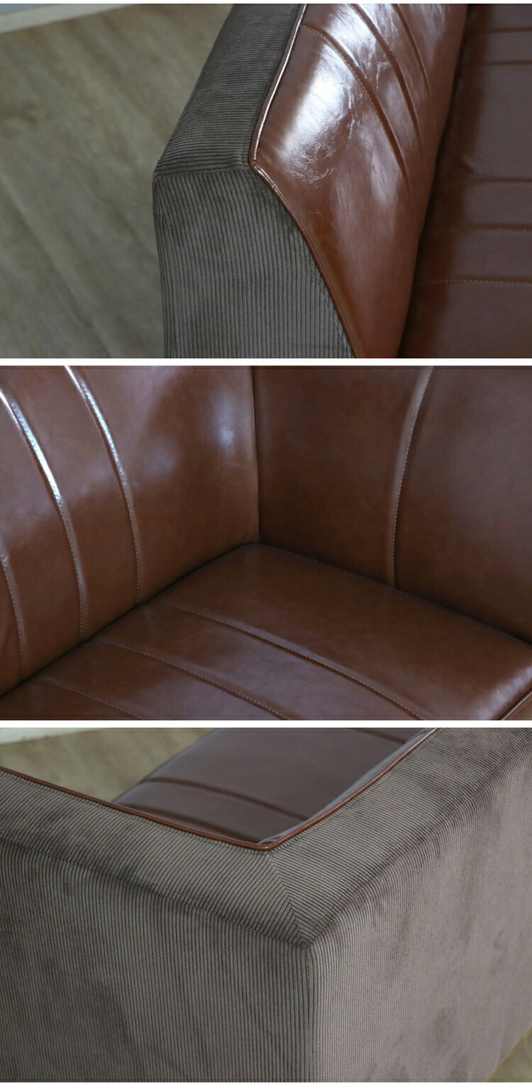 光沢があり高級感を感じさせるPVCレザー。ざっくりとしたカジュアルな質感のコーデュロイ生地。あたたかみのある天然木の幕板。