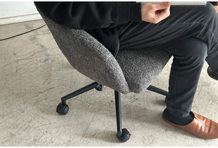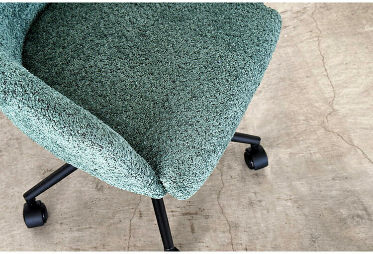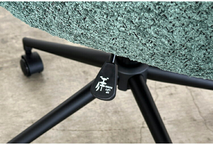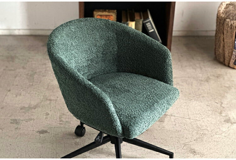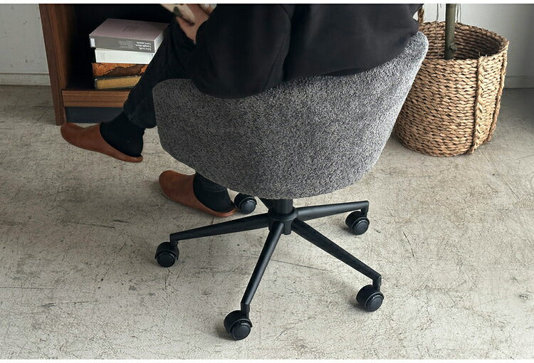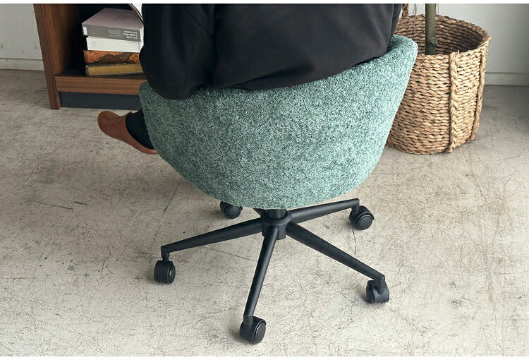手触りの良いもこもことしたブークレ生地を使用したマルっとした見た目もかわいらしく、卵型で包み込まれるようなワークチェアです。座面の高さはレバーで簡単に調整できます。