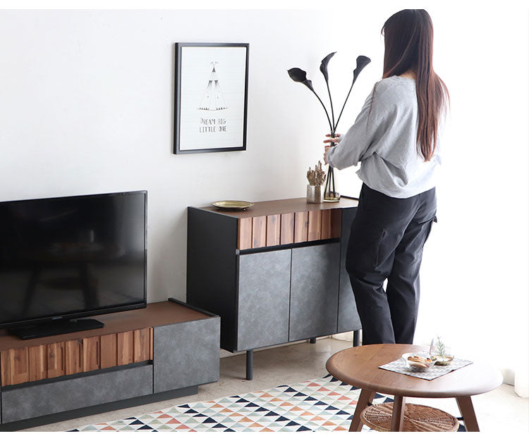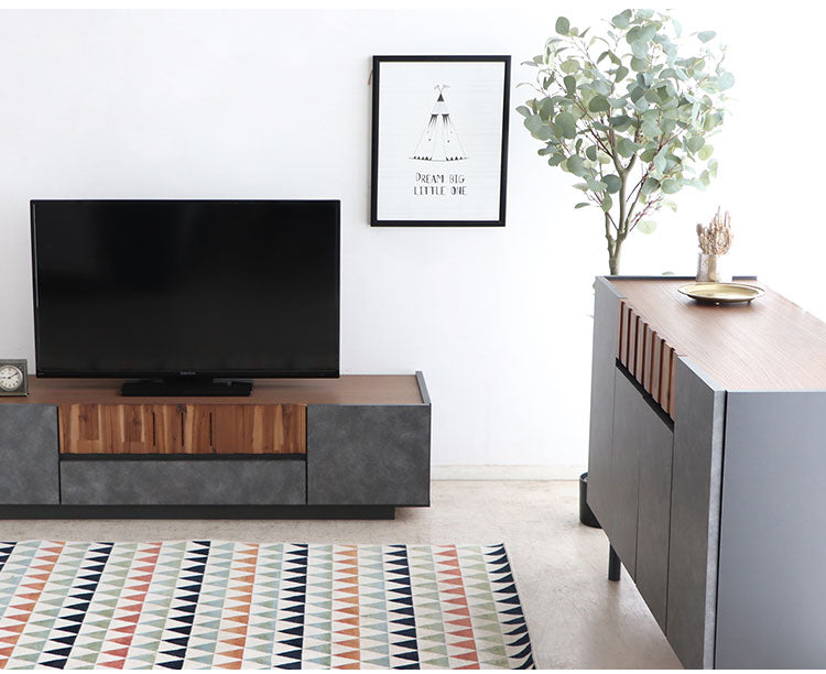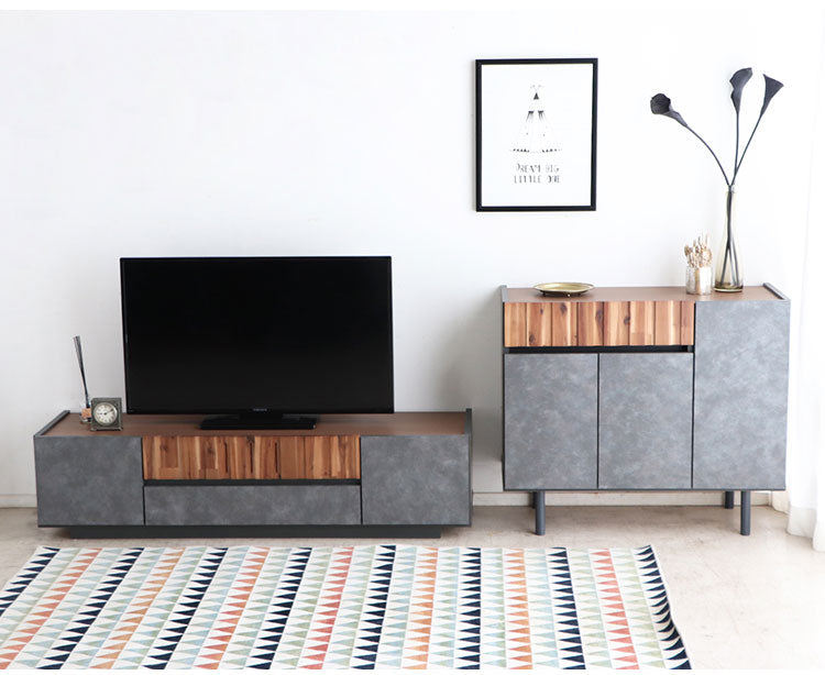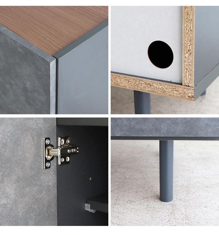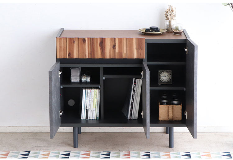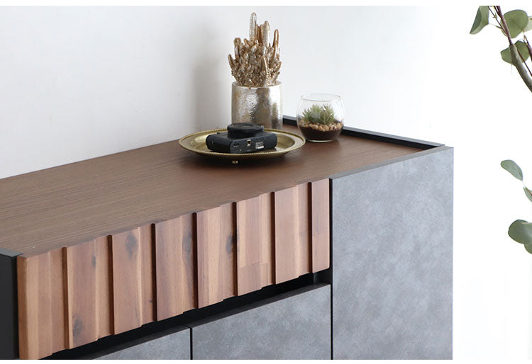 アカシア材の凹凸やコンクリ調の前板のリアルな質感が魅力のキャビネット。