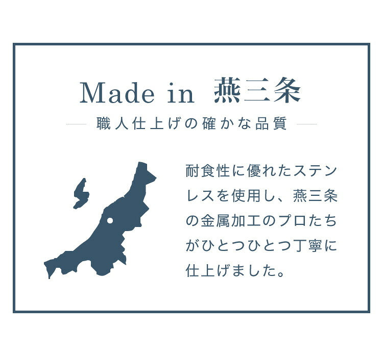 安心の日本・燕三条エリア製。金属加工の一大産地、新潟県燕三条エリアの職人により、1点ずつ細部までこだわって作られています。