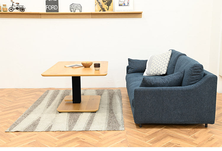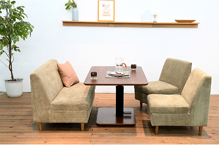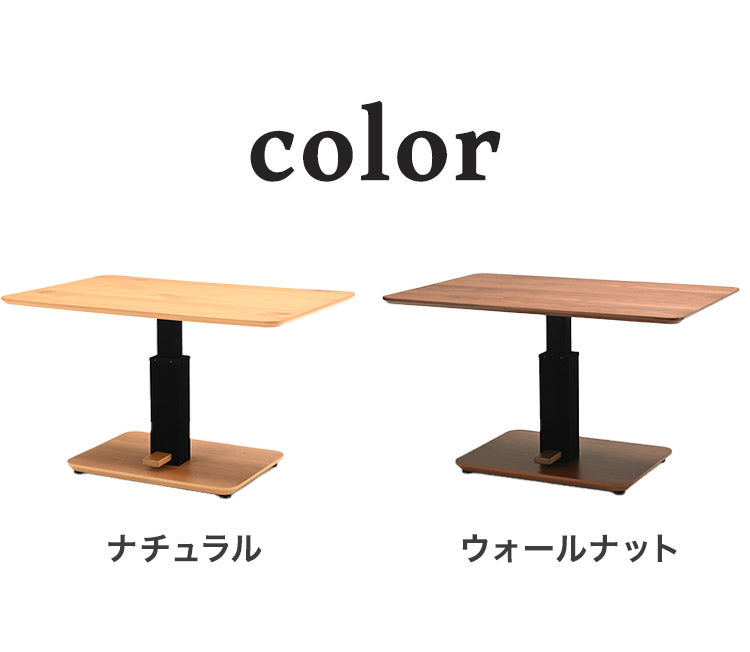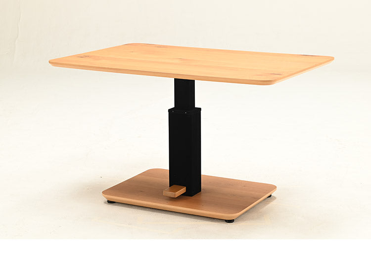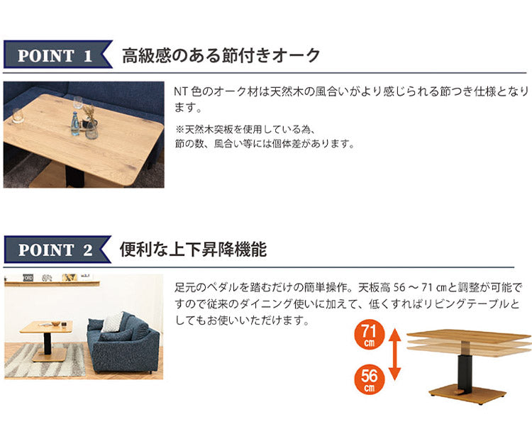 ペダルを踏むだけで、高さ調節が出来、ダイニング使いはもちろん、低くすればリビングテーブル使いとしても活躍します。