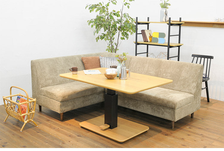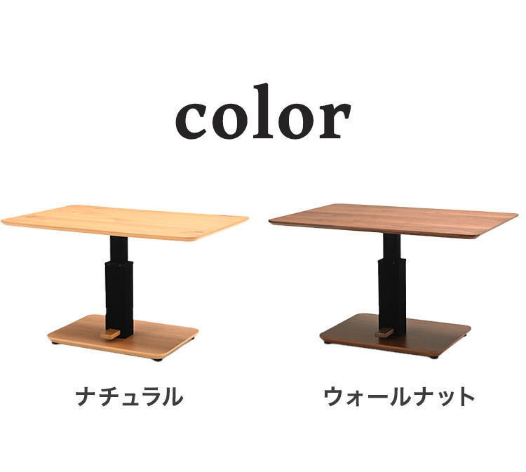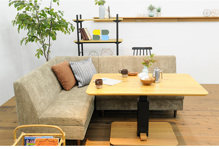 ペダルを踏むだけで、高さ調節が出来、ダイニング使いはもちろん、低くすればリビングテーブル使いとしても活躍します。