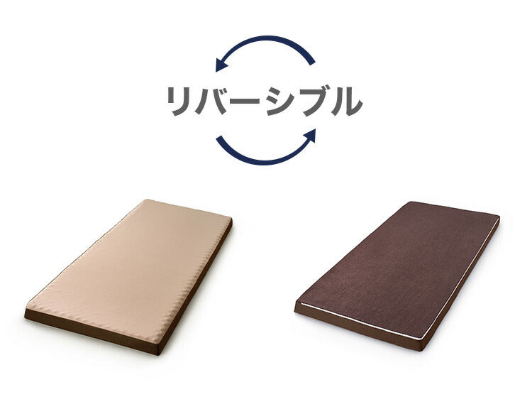 高反発ウレタンフォームと低反発ウレタンフォームの2層構造で、2種類の寝心地を選べるリバーシブルタイプのマットレスです。高反発は波形のウレタンフォーム(プロファイル加工)で、体が沈み込みすぎないようしっかりサポートします。低反発は体にフィットし、体圧を分散します。吸水速乾に優れたニット生地、やわらかな肌触りのパイル生地なので、オールシーズン使用できます。継ぎ目のない1枚タイプです。ロール状に圧縮梱包してあるので、持ち帰りが簡単です。(※復元後は、元のロール状態に戻すことができません。)
