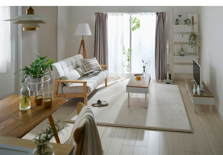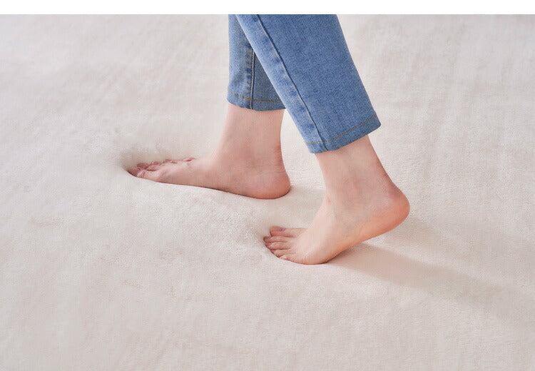 厚さ30mmの極厚ウレタンで床つきを感じさせないボリュームのあるラグです。もちっとした踏み心地で、表地はマイクロファイバーを使用し、なめらかでやわらかい手触りです。裏面にすべり止め加工を施しているため、ラグがずれにくく安心してご使用いただけます。遮音効果で気になる足音などの生活音を抑えられます。オールシーズン快適に使用できます。ホットカーペット対応です。輸送・持ち運びがしやすい圧縮梱包を行っています。開梱すると、折りじわやウレタンの潰れによるゆがみが生じる場合がありますが、使用しているうちに解消されます。