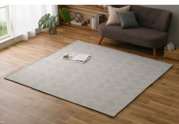 濃淡のある色糸をラフに織りあげた涼やかで肌触りのよいジャカードラグです。太めのタスラン糸を使用することで凹凸のある織り地になっています。ジャカード織りにより、ブロック柄を織り出しすっきりとした印象です。中材には消臭効果のあるウレタンを使用しています。裏面にすべり止めが付いているので、ラグがずれるのを防ぎます。オールシーズン快適にお使いいただけます。床暖房、ホットカーペット対応です。手洗い可能で、清潔を保てます。