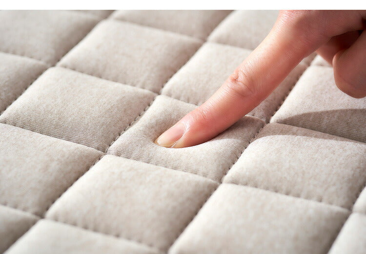ストレッチの効いた杢天竺をジオメトリック柄でモダンに仕上げたキルトラグです。生地はさらっとした肌触りです。厚さ15mmのウレタン入りで、クッション性がありふかふかです。消臭効果のあるウレタンを使用しています。裏面にすべり止めが付いているので、ラグがずれるのを防ぎます。オールシーズン快適にお使いいただけます。床暖房、ホットカーペット対応です。手洗い可能で、清潔を保てます。