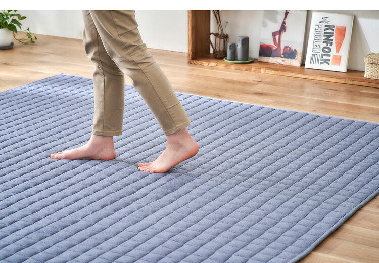 ストレッチの効いた杢天竺をジオメトリック柄でモダンに仕上げたキルトラグです。生地はさらっとした肌触りです。厚さ15mmのウレタン入りで、クッション性がありふかふかです。消臭効果のあるウレタンを使用しています。裏面にすべり止めが付いているので、ラグがずれるのを防ぎます。オールシーズン快適にお使いいただけます。床暖房、ホットカーペット対応です。手洗い可能で、清潔を保てます。