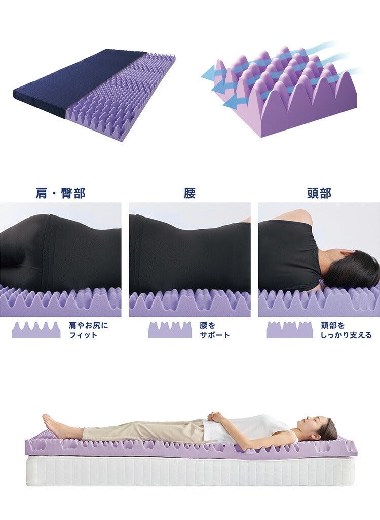 体の部位に合わせたかたさの異なるウレタンウォームを、7つにゾーニングし、睡眠時の理想的な姿勢である立位姿勢を促し、質の良い睡眠をサポートします。マットレス表面の凹凸を3種類の形状にし、サポートする部位に合わせてかたさを変えることで、体圧を分散させ負担のかかりにくい寝姿勢を促します。プロファイル加工により、マットレスと体の間に空気の通り道が生まれ、睡眠中のムレを防ぎます。単品使いやお使いの布団やマットレスの上に重ねてご使用いただけます。カバーは面ファスナー付きで持ち運びや収納も楽に行えます。ロール状に圧縮梱包してあるので、持ち帰りや搬入が簡単です。開封後、数日で本来のサイズに復元します。(※復元後は、元のロール状態に戻すことができません。)国内工場で生産(充填・加工)しています。
