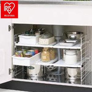 ねじを使わず簡単に組み立てられるシンク下収納です。スライドトレーが付いており、調味料類が倒れにくい構造になっています。シンク下の幅に合わせて伸縮でき、排水管を避けて設置できます。
