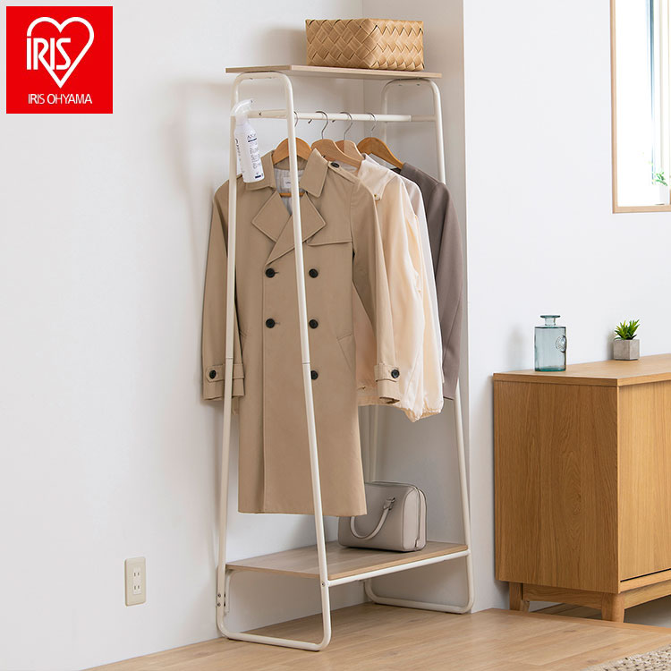 シワなく衣類を収納するのに適したデザイン性のあるスタイルハンガーです。ハンガーパイプには衣類をかけて収納し、棚板には帽子やカバンなどのファッション小物の収納ができます。
