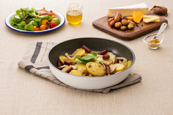【フライパン・なべ】表面加工/内側:ダイヤモンドコーティング、外側:焼付塗装加工、材質/本体:アルミニウム合金(底の厚さ3.0mm)、はり底:ステンレス鋼(クロム16%)【エッグパン】表面加工/内側:ダイヤモンドコーティング、外側:焼付塗装加工、材質/本体:アルミニウム合金(底の厚さ5.0mm)、はり底:ステンレス鋼(クロム16%)【ガラスふた】ふた本体:強化ガラス(全面物理強化)、ゴム部:シリコン樹脂(耐熱温度220℃)【PEシールふた】ポリエチレン(耐熱温度80℃)【マルチハンドル】樹脂上部:ガラス入りナイロン(耐熱温度180℃)、樹脂下部:フェノール樹脂(耐熱温度150℃)、金属部:ステンレス鋼、ゴム部:シリコン樹脂(耐熱温度220℃)