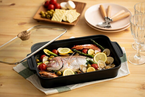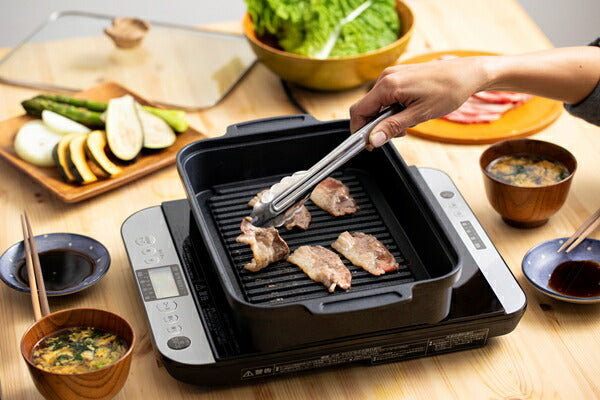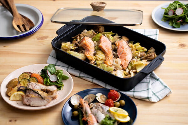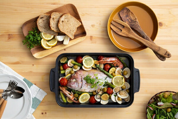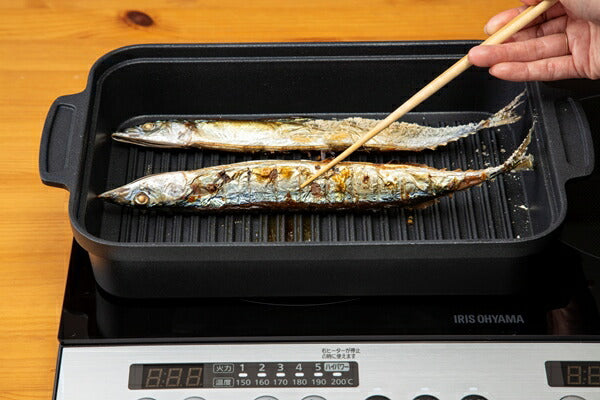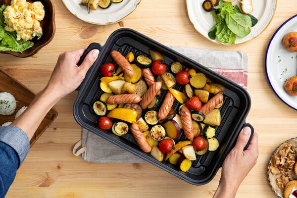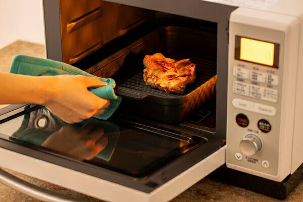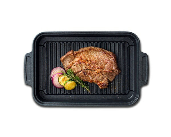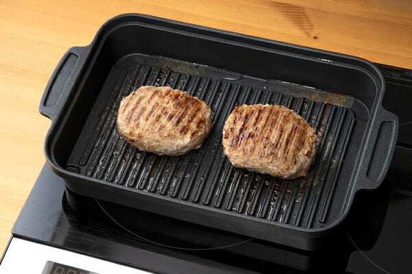 基本仕様 グリルパンサイズ(約) 372×223×60mm 満水容量(約) 2.9L 対応熱源 IH・ガスコンロ・ラジエントヒーター・オーブン・その他の電気ヒーター対応(※本体のみオーブン可、電子レンジでは使用できません。)