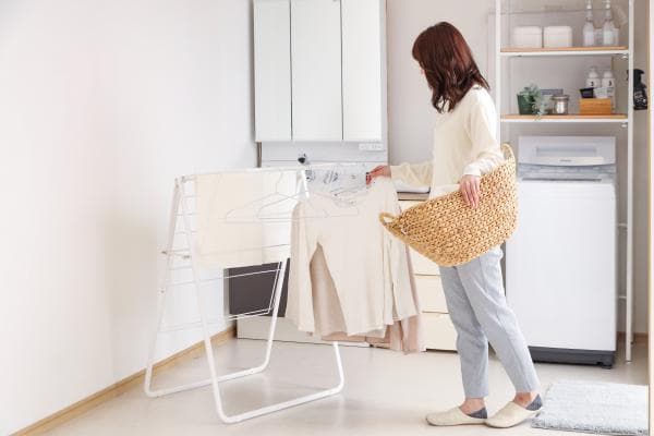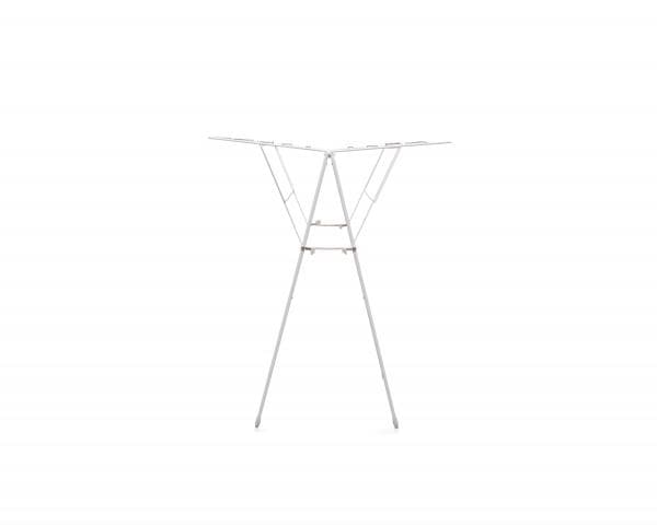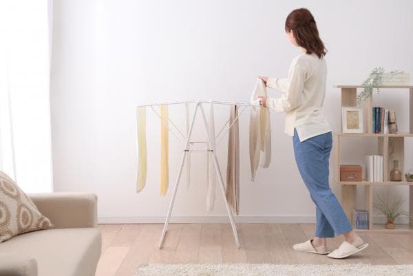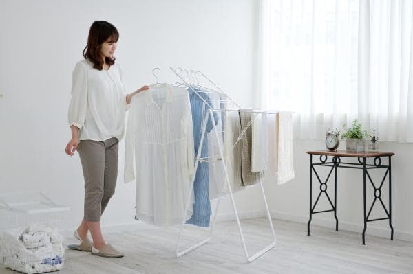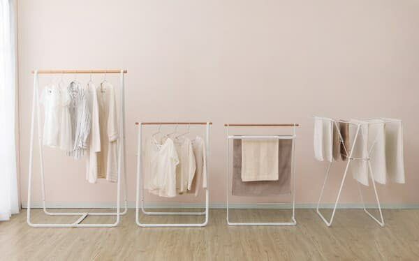 マットな質感のスチールパイプで、お部屋に置いても圧迫感のないシンプルなデザインの室内物干しです。衣類やタオルのほか、大判サイズのバスタオル、まくらやセーターなどの平干しもできます。支え位置を変更するとハンガー部の高さを調整することができます。使用しないときは折りたたんで、コンパクトに収納が可能です。簡単に組み立てができます。