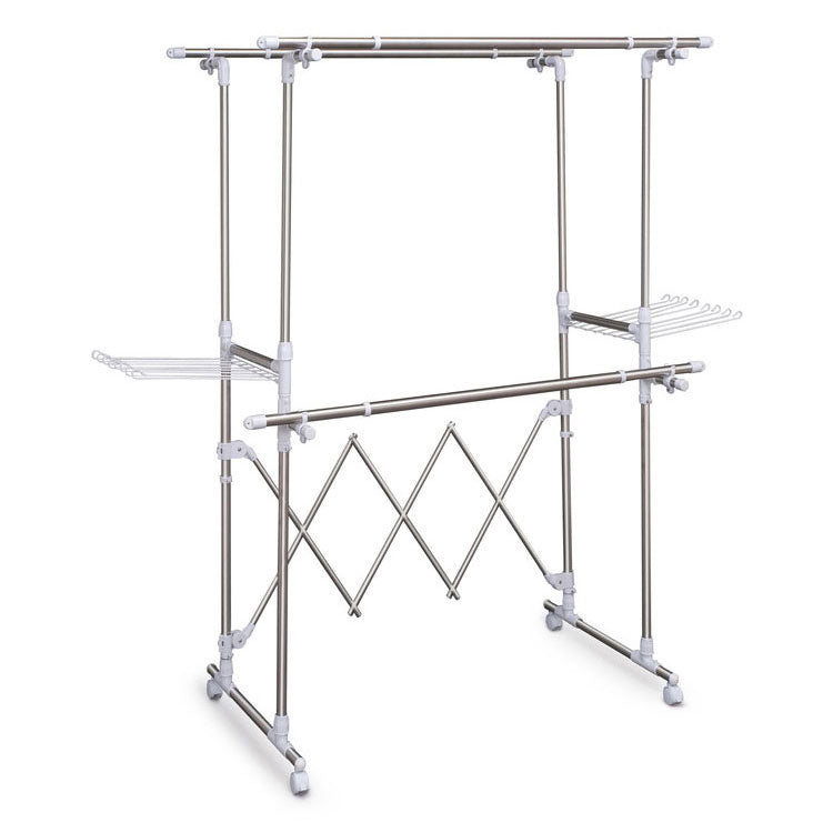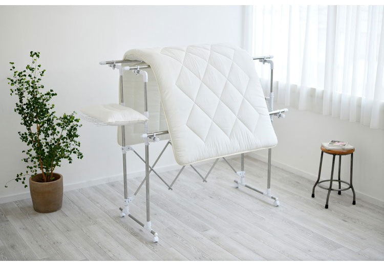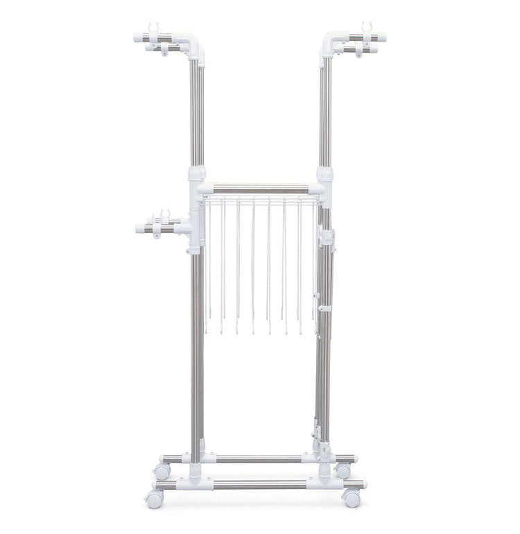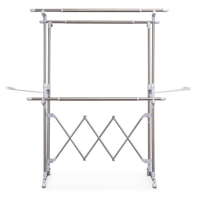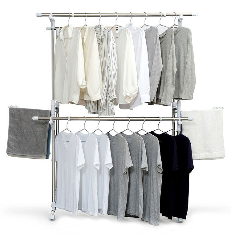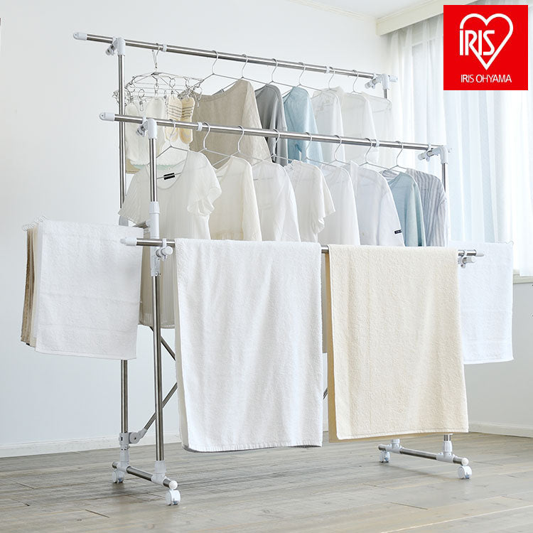 干す量やスペースに合わせて、幅も高さも調節可能な大型伸縮タイプの物干しです。段違いに干せるので、風通しが抜群で効率よく乾きます。大容量の洗濯物を干すことができ、ワンピースやズボンなどの長物も干せます。安定した脚部で前倒れしにくい設計です。タオルハンガー付きです。移動に便利なキャスター付きで、使用しないときは折りたたんでコンパクトに収納できます。