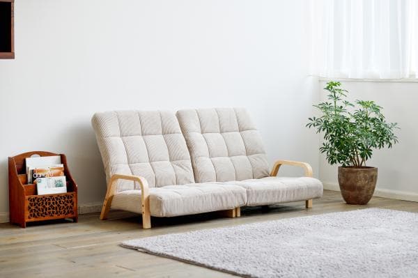 立ち上がりやすい曲げ木のアーム付きのチェアです。あぐらのかける幅広タイプです。コンパクトに折りたためます。和室、洋室問わず様々なインテリアにマッチするデザインです。2台を連結して2人掛けチェアとしても使用できます。ソファやチェアで人気のコーデュロイ生地を採用しています。