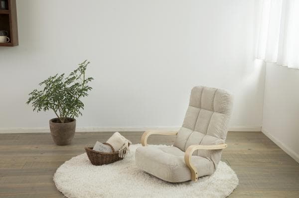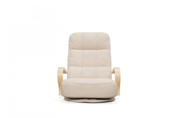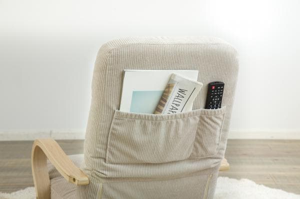 立ち上がりやすい曲げ木のアーム付きのチェアです。360°回転するので、座ったまま近くのものを取ることができます。背面には大きさの違う2つのポケットが付いていて、リモコンや雑誌、新聞などを収納できます。和室、洋室問わず様々なインテリアにマッチするデザインです。コンパクトに折りたためます。ソファやチェアで人気のコーデュロイ生地を採用しています。