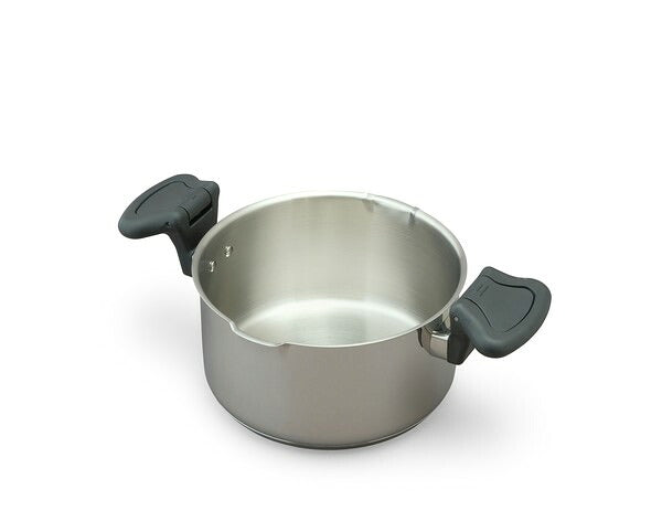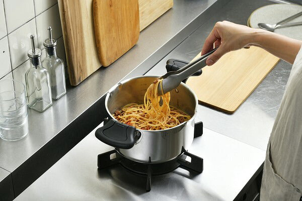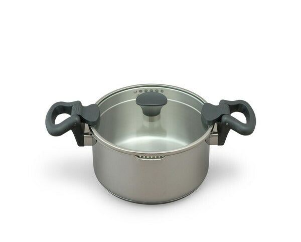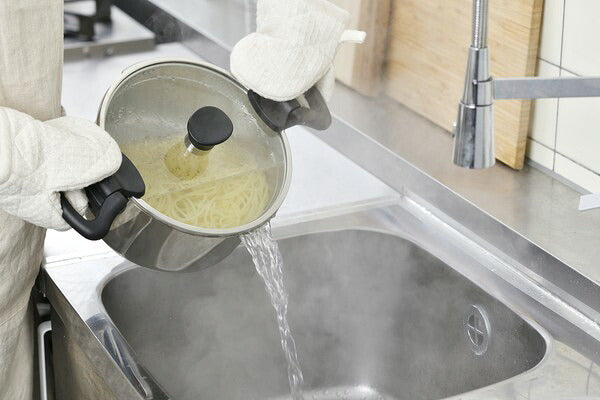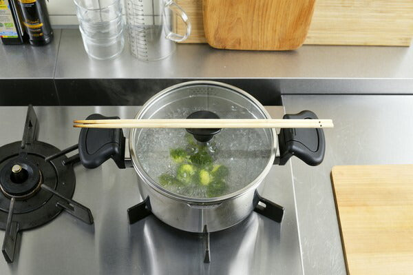丈夫で保温力が高く、熱効率が良いステンレス製の湯切り鍋です。ガラスふたに大・小2種類の穴があり、食材を鍋に入れたまま湯切りができます。鍋の内側には便利な計量目盛りが付いており、ふたのつまみは菜箸などのキッチンツールが置けます。両手鍋20cmにはハンドル部分に湯切り時に便利なふた押さえ機能が付いています。
