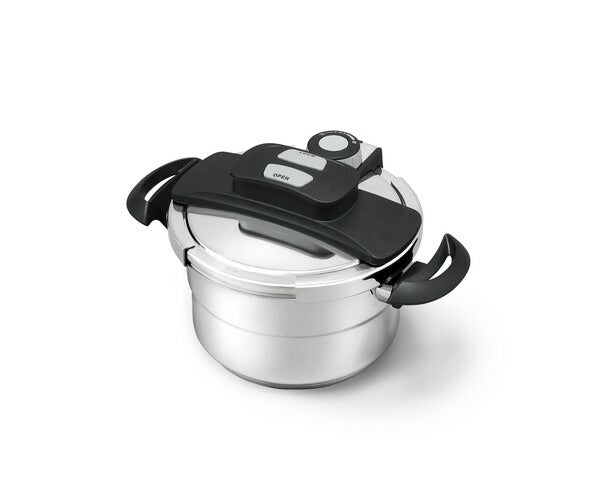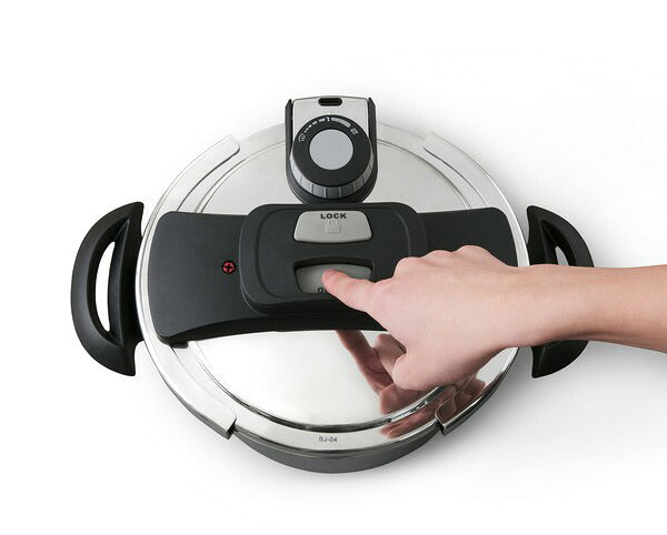 料理に応じて低圧・高圧の切り替えが簡単にできるダイアル式の両手圧力鍋3L・5Lのセットです。圧力の状態が一目でわかる圧力表示付きです。ふたはボタンを押すだけのワンタッチ開閉です。圧力調整装置で余分な蒸気を排出し、圧力を一定に保ちます。圧力がかかっているときはロックピンが上がり、ふたをロックします。また、鍋の圧力が完全に下がらないとふたが開かない安全設計です。鍋を2つ重ねて収納できます。