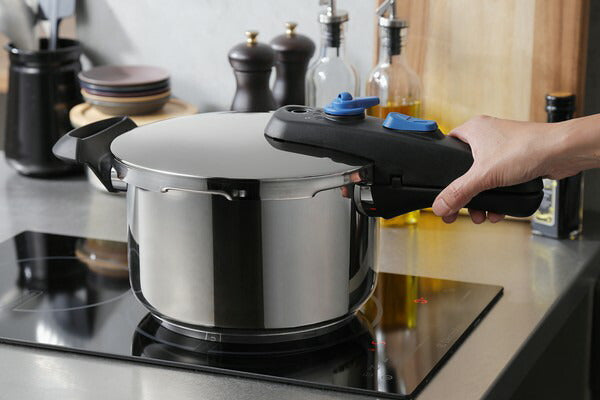 料理に応じて低圧・高圧の切り替えが簡単にできるレバー式の片手圧力鍋です。ふたの開閉はボタンを押しながらスライドするだけと操作が簡単です。閉めるときはふたと本体のマークを合わせてからスライドします。圧力調整装置で余分な蒸気を排出し、圧力を一定に保ちます。圧力がかかっているときはロックピンが上がり、ふたをロックします。また、鍋の圧力が完全に下がらないとふたが開かない安全設計です。
